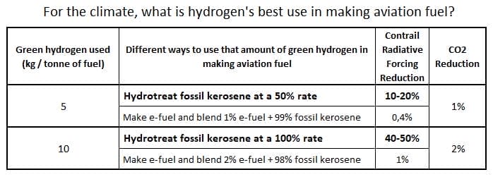The aviation sector plans to use massive amounts of green hydrogen as a raw material to make alternative fuels, biofuels and e-fuels. But green hydrogen will be in very short supply for decades. It would be more efficient to first use the available green hydrogen to hydrotreat conventional fossil kerosene than to use it to produce SAF. For the same small quantity of hydrogen, the total climate impact of jet fuel could be reduced a lot more by hydrotreating kerosene than by producing some SAF and blending it with non-hydrotreated kerosene.
