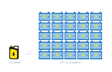 Electric aircraft likely to be certified this decade will be very small and serve only very short flights. Batteries are too heavy to replace most jet fuel and combustion engines. Given the average efficiency of a thermal engine, 1kg of fuel equals 25-30 kg of batteries (see graph). Short flights can in many cases be easily replaced by much more energy-efficient ground transport.